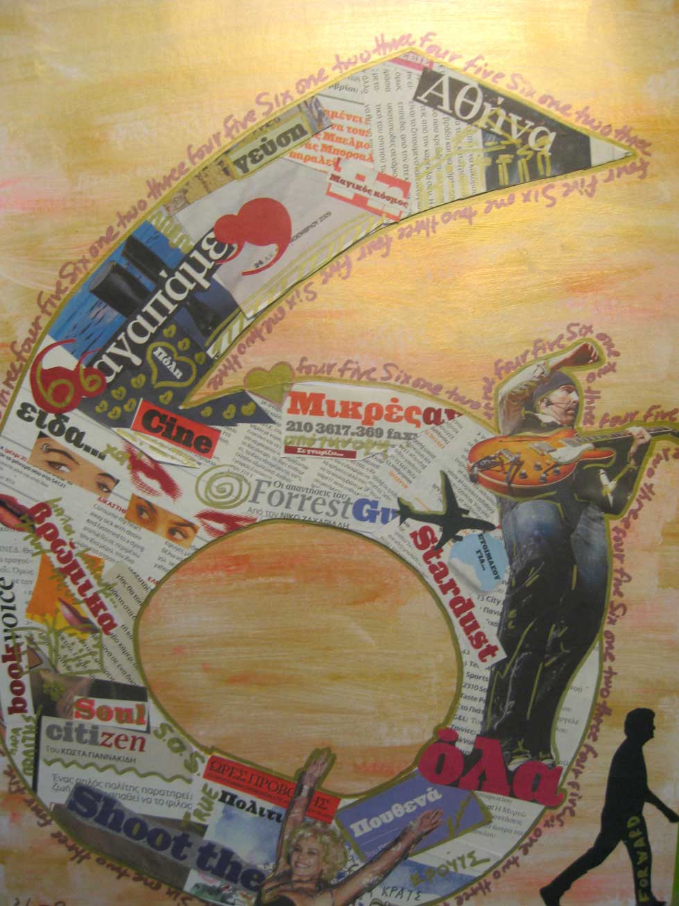 Εμπνευσμένο από τα γενέθλια γνωστής εφημερίδας. Οι λέξεις, οι εικόνες και τα χρώματα σχηματίζουν τον γενέθλιο χρόνο. Μεικτή τεχνική ντεκουπάζ και ζωγραφική με ακρυλικά σε ακουαρέλα.