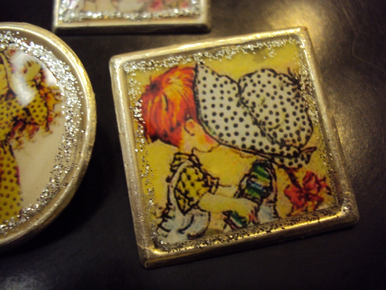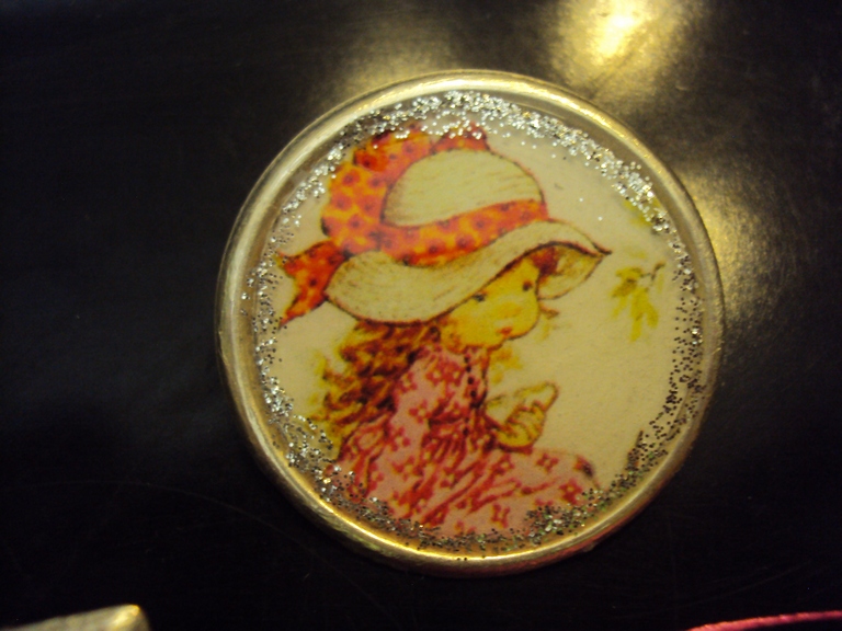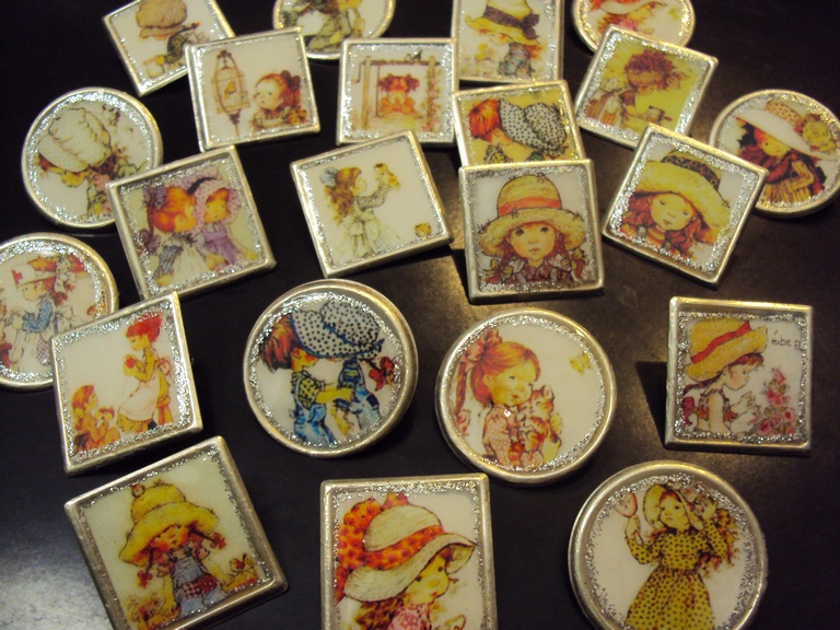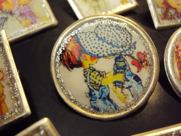Μενταγιόν, κλειδοθήκες και καρφίτσες με εικόνες Sarah Kay σφραγισμένες με υγρό γυαλί.