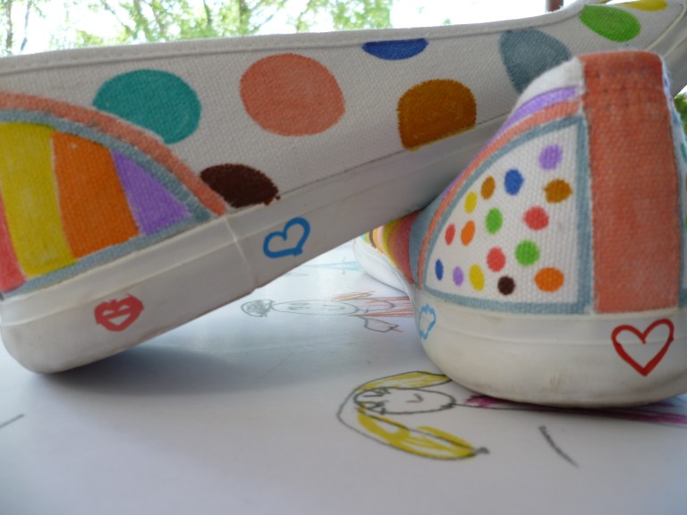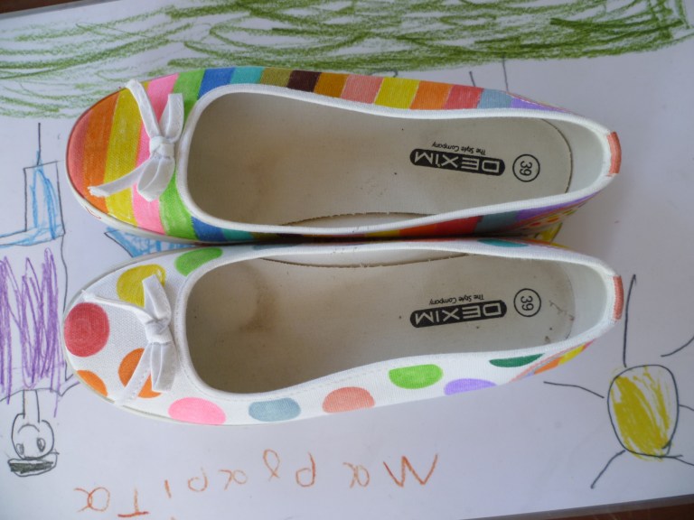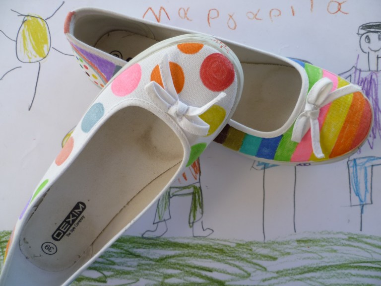 Τα λευκά πάνινα παπουτσάκια απέκτησαν πολύχρωμες ρίγες και πουά κι έγιναν ακόμα πιο χαρούμενα.
