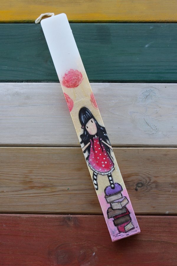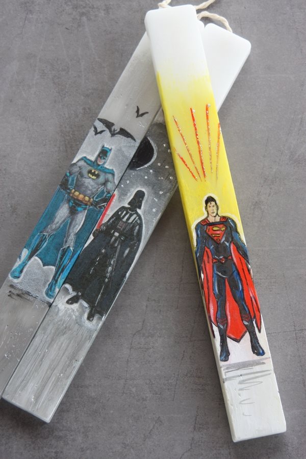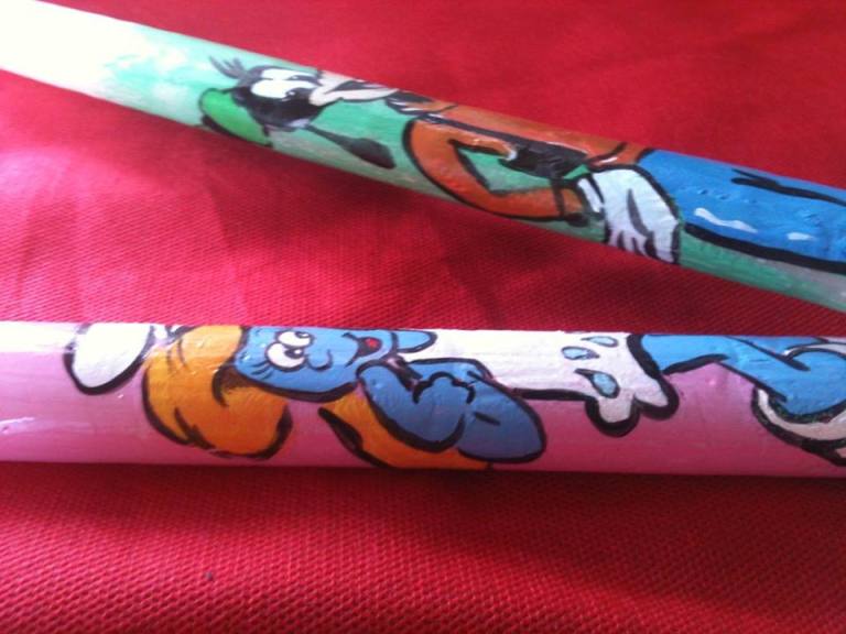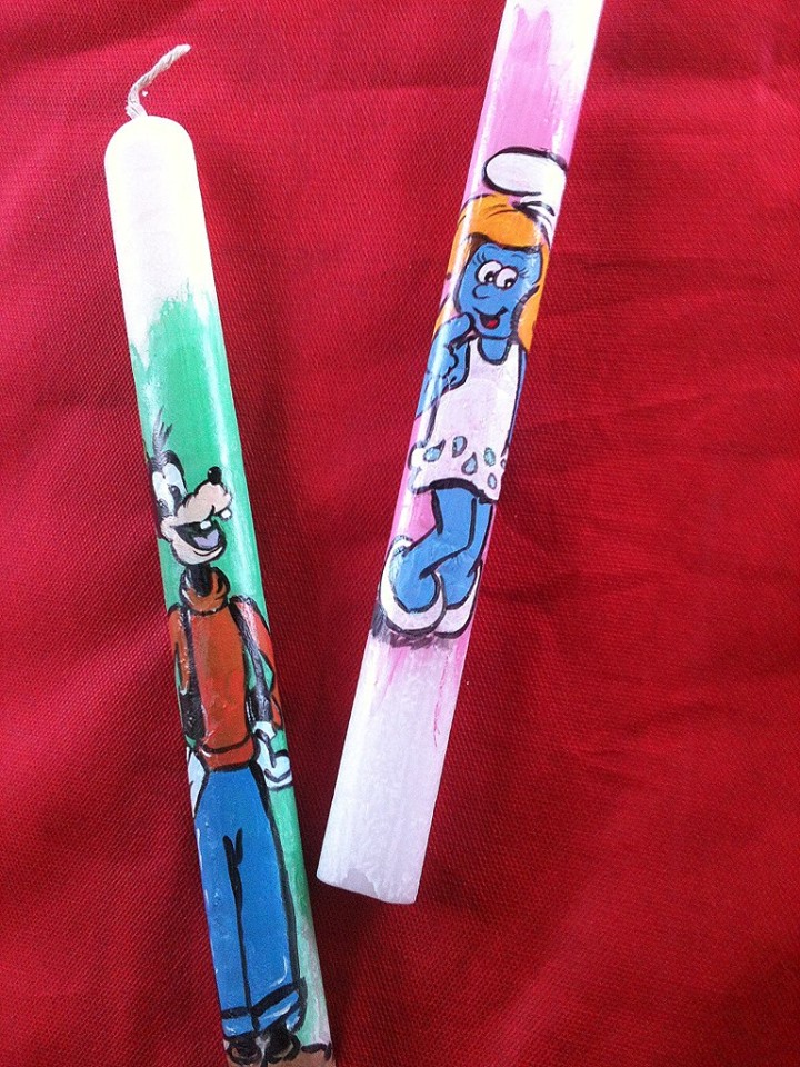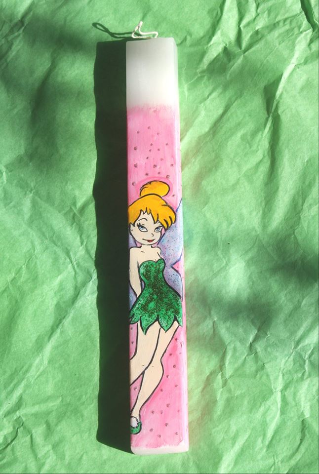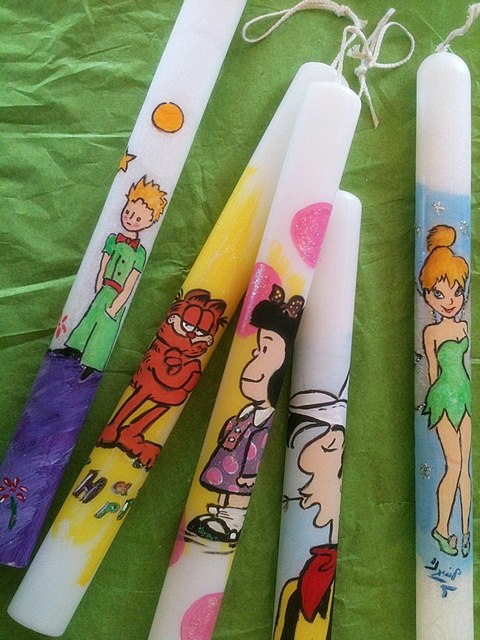 Διαλέξτε τον αγαπημένο σας ήρωα! Ο Garfield, ο Λούκι Λουκ, ο Μικρός Πρίγκιπας, η Mafalda, η Tinkerbell… η λίστα είναι ατελείωτη! Όλες οι λαμπάδες είναι ζωγραφισμένες μία μία στο χέρι – γι’ αυτό και καθεμία είναι μοναδική και ξεχωριστή- με ακρυλικά χρώματα, glitter και ειδικό βερνίκι για να σταθεροποιηθούν τα χρώματα.
