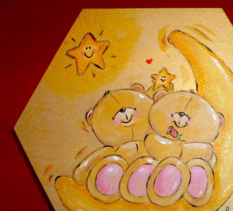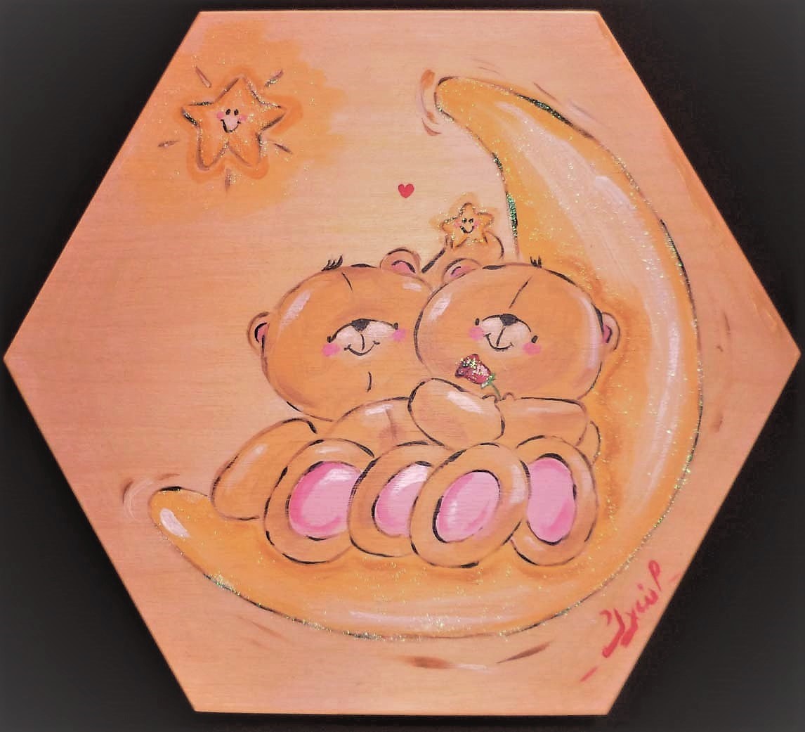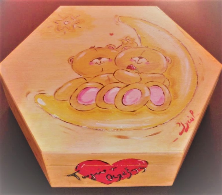 Κρύψε μέσα του τα πιο αληθινά σου μυστικά και χάρισέ τα στον καλύτερο σου φίλο. Σφράγισε τη φιλία σας με ένα τόσο προσωπικό δώρο. Τα δημοφιλή αρκουδάκια FOREVER FRIENDS θα κρύψουν στην κοιλίτσα τους τις πιο όμορφες κοινές σας αναμνήσεις. Πολυγωνικό ξύλινο κουτί ζωγραφισμένο στο χέρι με ακρυλικά χρώματα.